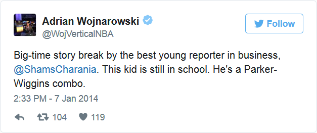 事实上,在近些年的NBA选秀大会与转会窗口打开期间,这样的情况已经屡见不鲜。Woj经常会在推特上报道突发新闻,他的粉丝们已经拒绝把Woj的推特和其他推特混为一谈,他们开始把Woj的推特称为“#WojBomb”。而有些联盟的经理甚至会为了不错过Woj的任何一条推特而特地开启推特的短信通知功能。