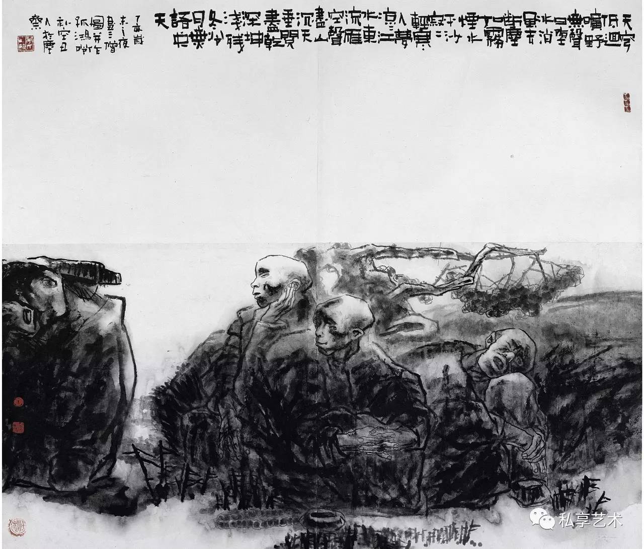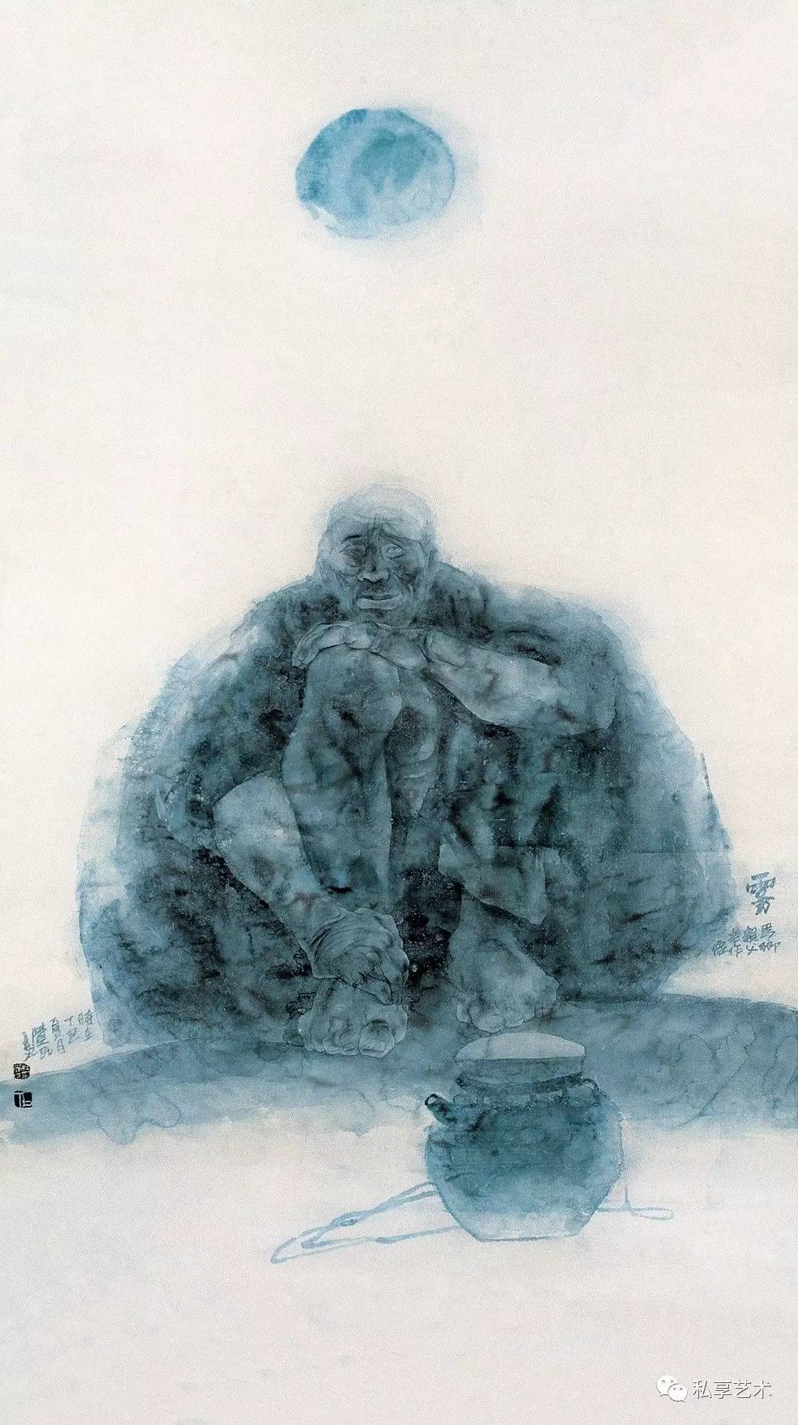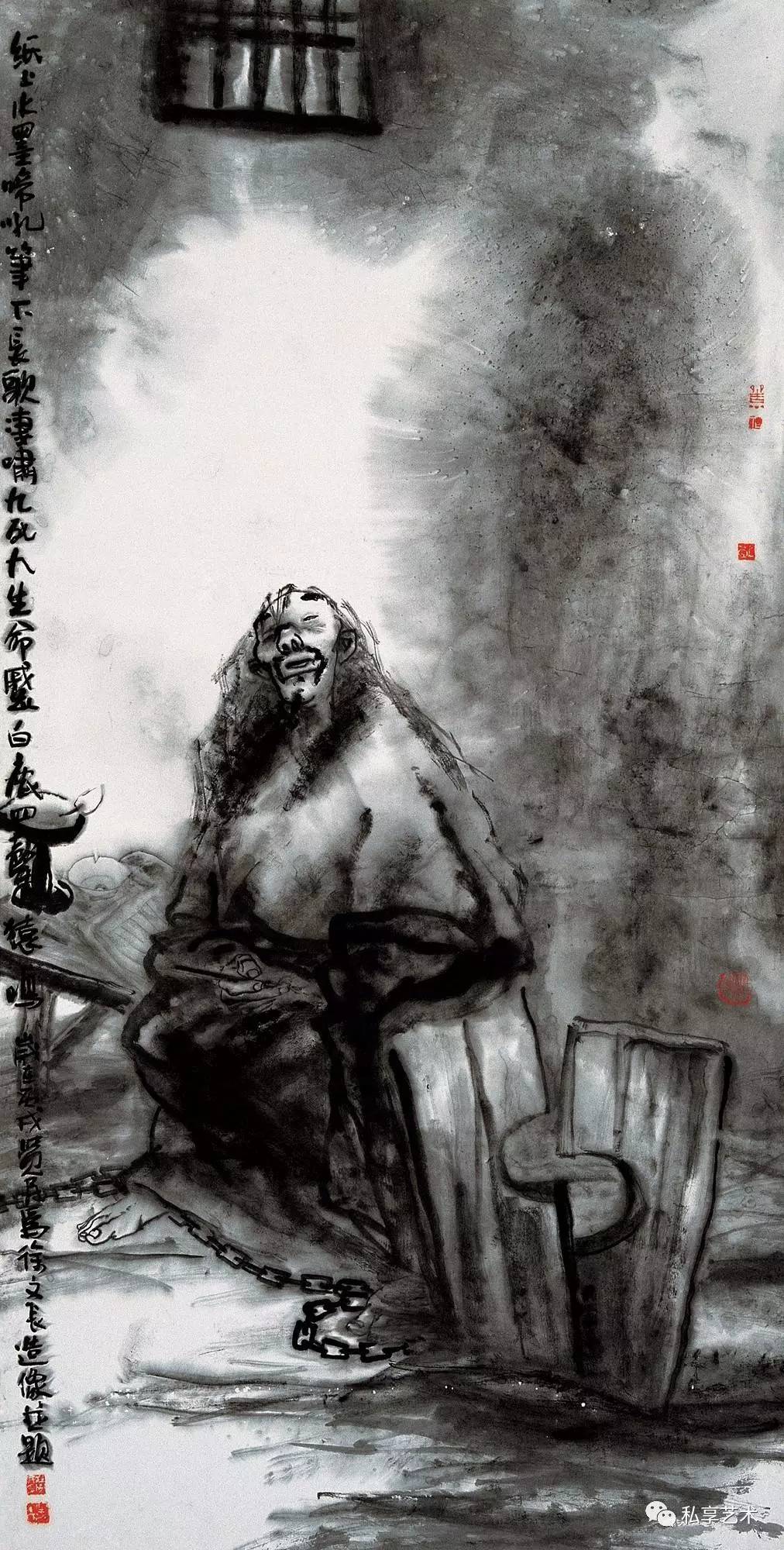 2006年(丙戌),已到知天命之年的画家正忙于博士毕业创作和论文,日日与徐渭神交,用水墨大写意画了一幅《徐文长造像》。徐渭一生可圈可点、可记可画之事甚多,画家偏偏选择了他在狱中著书的场景,为了突出人物的痛苦与落魄,还特意把木枷锁与铁链画在前景突出位置。历史上的徐渭身陷囹吾期间得到过朋友与官府的许多关照,这个场景反映的其实是画家自己彼时彼地的困境感:近则是毕业创作与论文的压力,远则是站在人生中间点上,那种四顾空茫的虚无感和无力感。然而这个阶段他的思想已经出现了明显的变化,对立变成面对,质疑变成解说与消解。正如画上几块涨墨之间的留白形成了高高的小窗洩露了天光。眼前没有门,顶上却有窗,人生境界之高远,不是因为盯著自己的脚下的影子。画家把对自己苦难的咀嚼,化成了对普通民众乃至底层贫民更为宽厚而强烈的人文关怀。