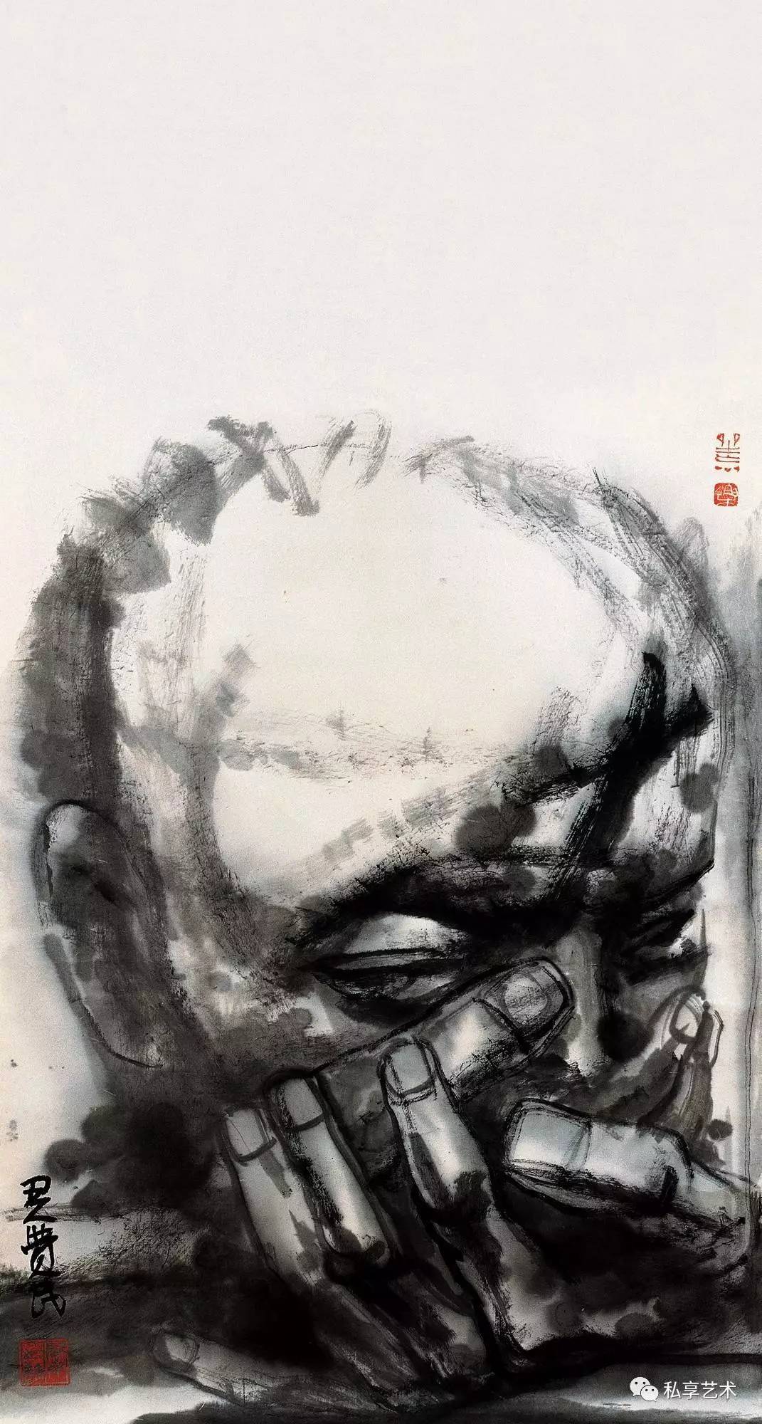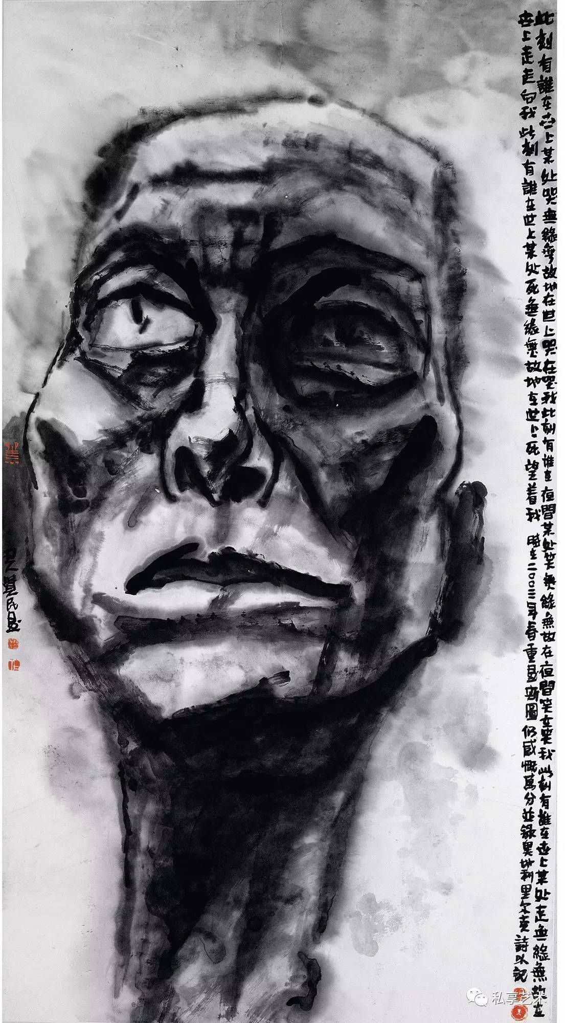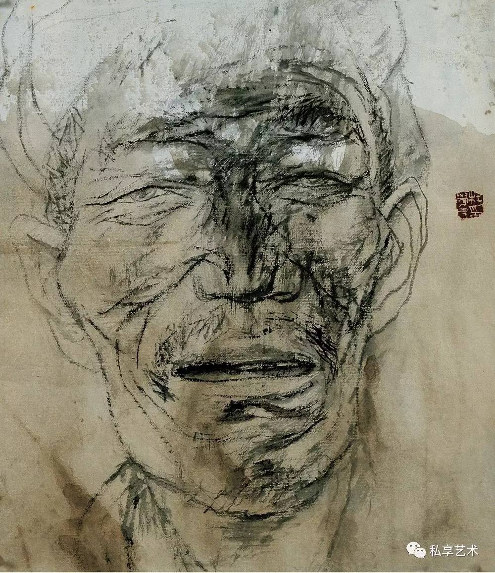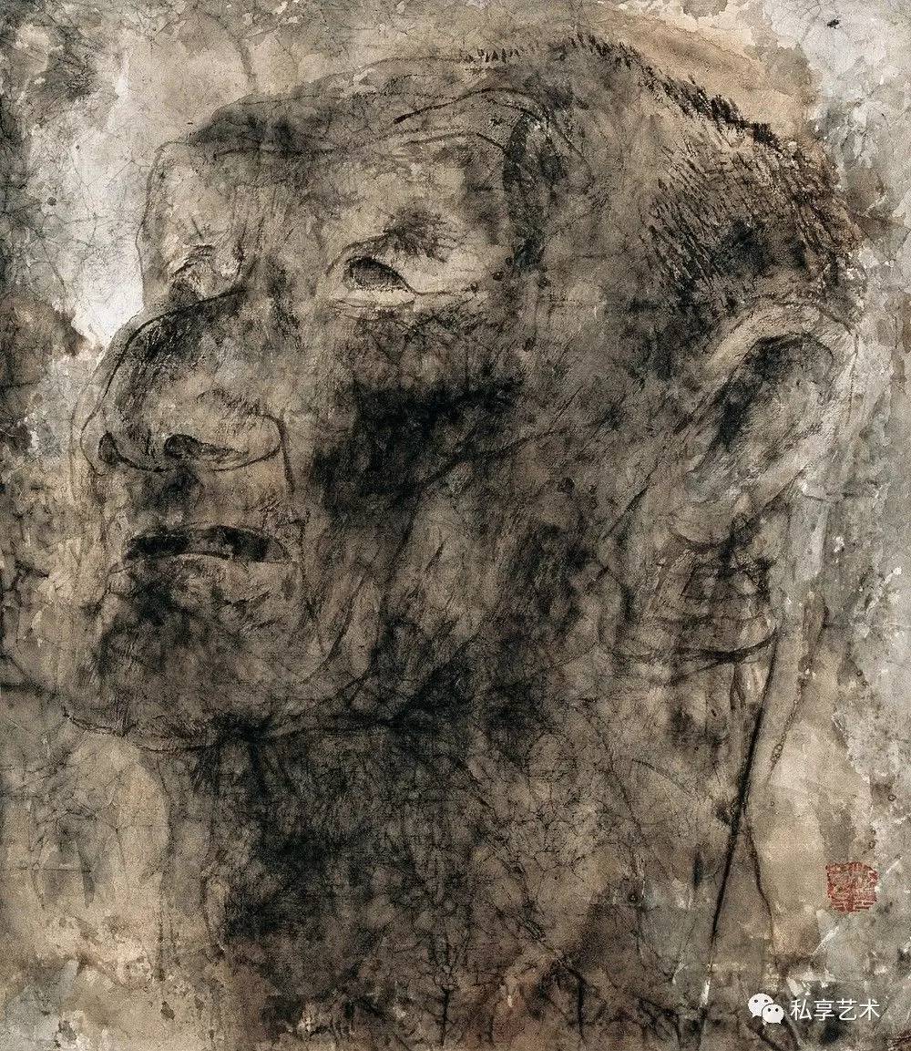 许多有良知的画家都把关注的目光和包含同情的画笔指向底层民众,但很少有人像他这样大量地画进城务工的苦力和街头的贩夫走卒。大量的作品都是写生稿,可以想像身背画夹的画家无数次混迹于市井和工棚。他们并不仅仅用脸上的皱纹和破旧的衣衫为画家提供线条与形式的种种可能,他熟悉他们的生存状况,瞭解他们的喜怒哀乐,同情他们的艰难困苦。他们在有些人的眼中卑贱如蝼蚁,但在他的眼中并不是凡夫俗子,而是讚美甚至崇拜的对象。因了纸上涨墨的效果,街头拉二胡的瞎子,有如一尊光芒四射的佛像,推著自行车、穿著棉袄戴著皮帽的工人(像一个矿工),深邃的眼神和头部的光芒使他看我来就像耶稣。虽说禅宗早就主张“遍界是佛身”,但真能看到这个境界,正说明观察者心中有佛。正如奥地利诗人里尔克的诗《严重时刻》所吟:“此刻有谁在世上某处哭,无缘无故地在世上哭,在哭我。此刻有谁在夜间某处笑,无缘无故地在夜间笑,在笑我。此刻有谁在世上某处走,无缘无故地在世上走,走向我。此刻有谁在世上某处死,无缘无故的在世上死,望著我。”画家与诗人心有戚戚焉,在一幅大头像上抄录了这首诗。作为人文学者的画家,未必执著于一种人文宗教,未必要当仪轨上的教徒,却必得是哲学上的信众,必得以宗教的大悲悯释怀于自己的苦难,却迎面走向他人的苦难。