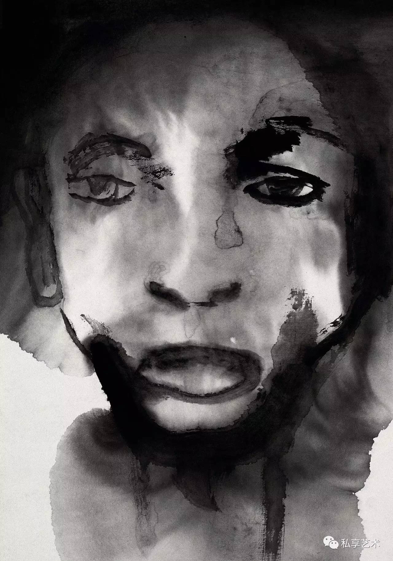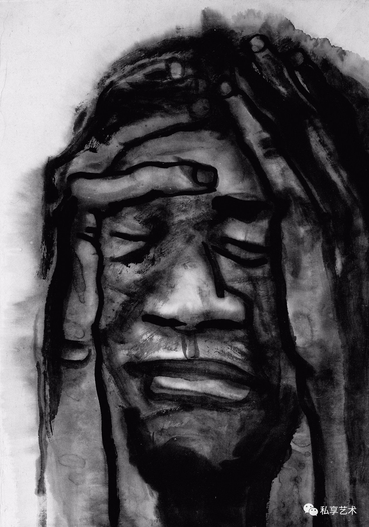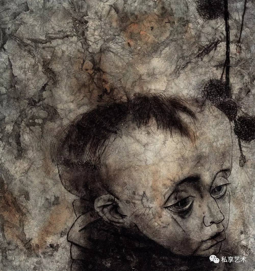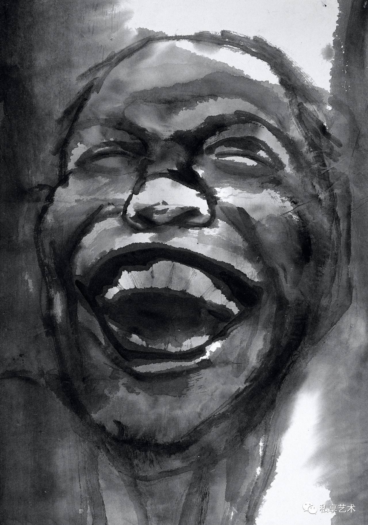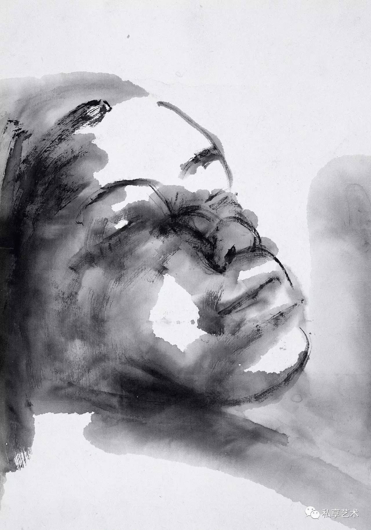 许多有良知的画家都把关注的目光和包含同情的画笔指向底层民众,但很少有人像他这样大量地画进城务工的苦力和街头的贩夫走卒。大量的作品都是写生稿,可以想像身背画夹的画家无数次混迹于市井和工棚。他们并不仅仅用脸上的皱纹和破旧的衣衫为画家提供线条与形式的种种可能,他熟悉他们的生存状况,瞭解他们的喜怒哀乐,同情他们的艰难困苦。他们在有些人的眼中卑贱如蝼蚁,但在他的眼中并不是凡夫俗子,而是讚美甚至崇拜的对象。因了纸上涨墨的效果,街头拉二胡的瞎子,有如一尊光芒四射的佛像,推著自行车、穿著棉袄戴著皮帽的工人(像一个矿工),深邃的眼神和头部的光芒使他看我来就像耶稣。虽说禅宗早就主张“遍界是佛身”,但真能看到这个境界,正说明观察者心中有佛。正如奥地利诗人里尔克的诗《严重时刻》所吟:“此刻有谁在世上某处哭,无缘无故地在世上哭,在哭我。此刻有谁在夜间某处笑,无缘无故地在夜间笑,在笑我。此刻有谁在世上某处走,无缘无故地在世上走,走向我。此刻有谁在世上某处死,无缘无故的在世上死,望著我。”画家与诗人心有戚戚焉,在一幅大头像上抄录了这首诗。作为人文学者的画家,未必执著于一种人文宗教,未必要当仪轨上的教徒,却必得是哲学上的信众,必得以宗教的大悲悯释怀于自己的苦难,却迎面走向他人的苦难。