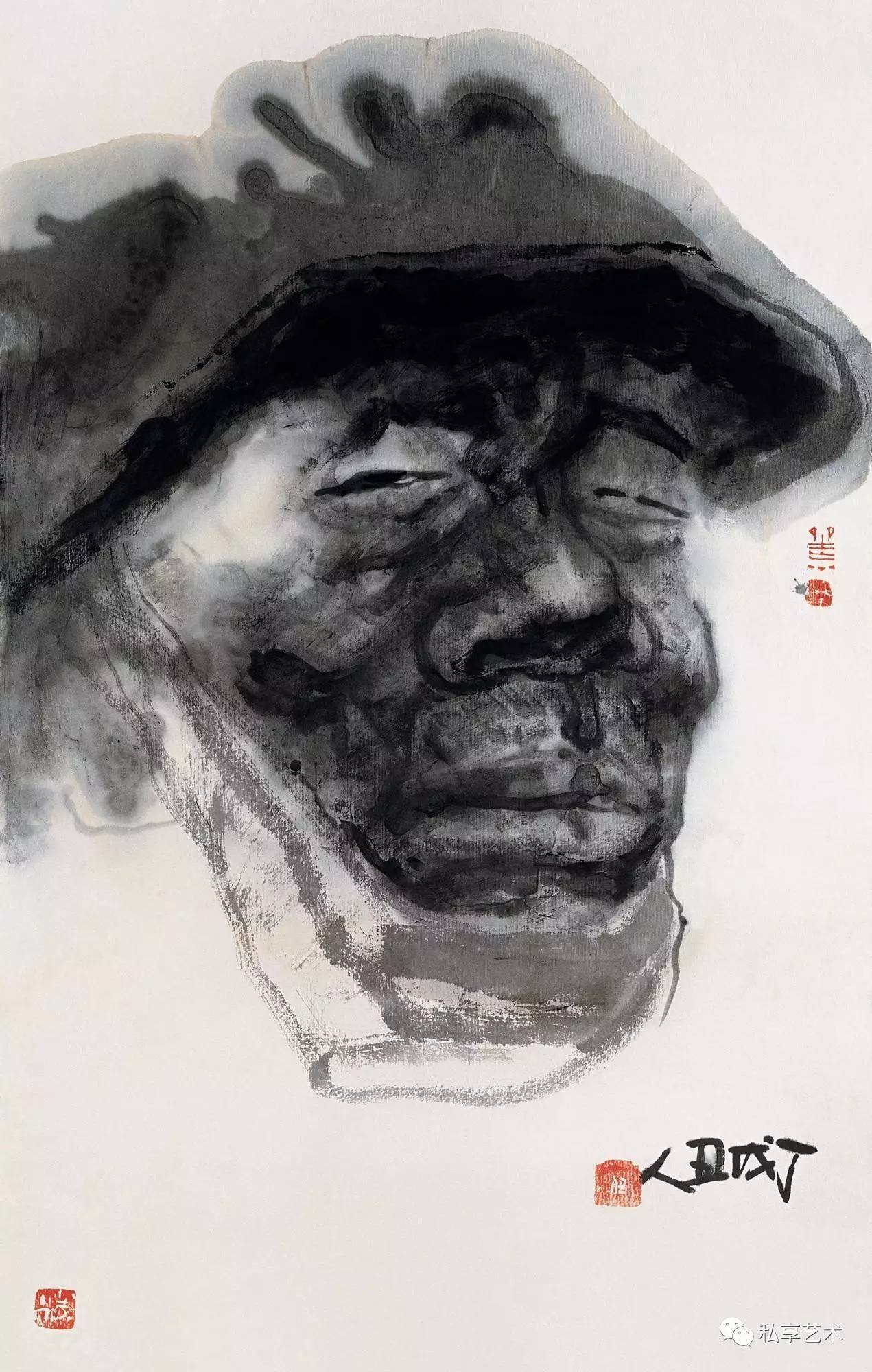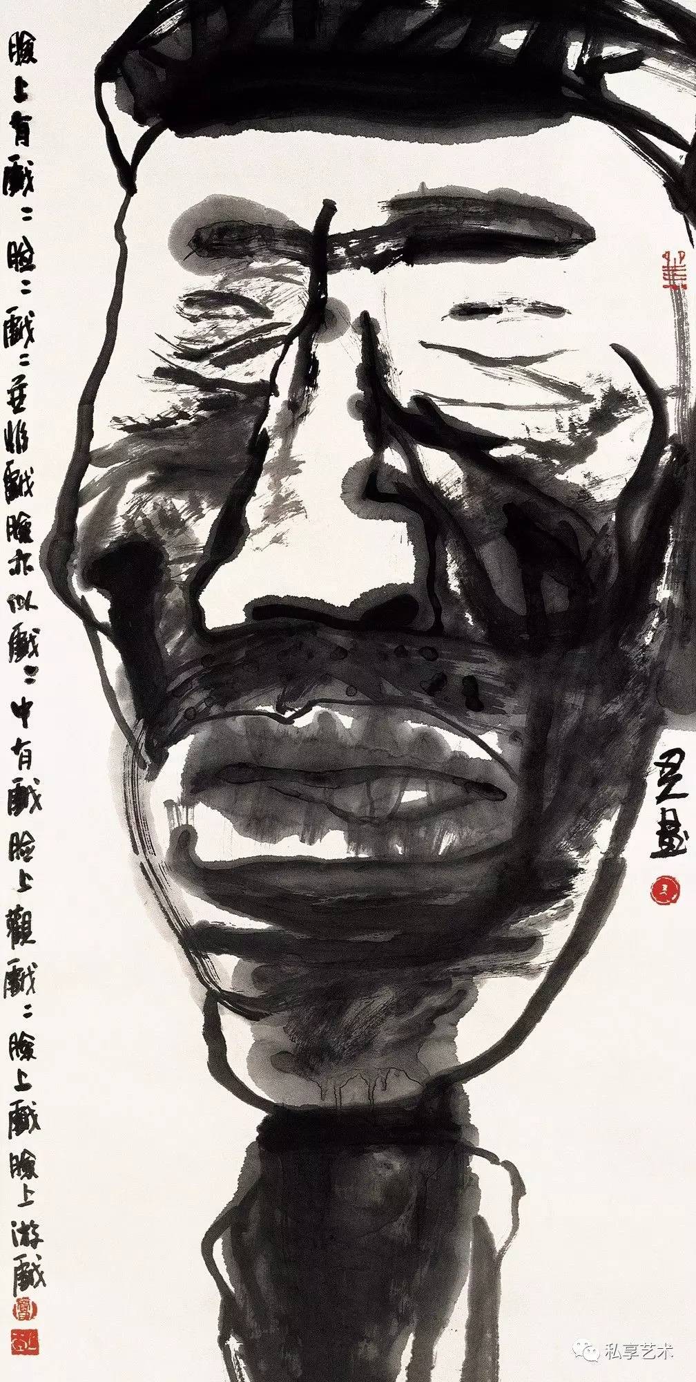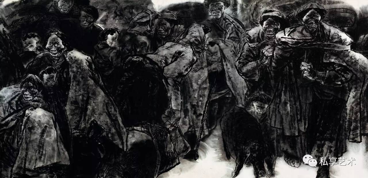视觉上的简化,首先要对物象进行提炼。这种提炼以扎实的课堂与现场写生和光影素描为基础,但他并没有循此路数发展下去(发展下去的结果是成为第二个叶浅予、黄胄、周思聪......唯独不能成为他自己),而把汲取灵感的范围扩大到几个相隔甚远的领域——漫画的夸张与黑色幽默、汉画简化的块状感与黑白对比,甚至岩画和世界范围内的“原始艺术”的造型与符号。漫画和汉画是中国绘画的边缘,但并非与水墨画传统绝缘,而岩画和原始艺术则已被吸纳为西方现代艺术的元素,对它们的利用也是中国画形式现代化的一种路径。为了与画面造型与气质相符,他的书法也取法有民间渊源的魏碑字,主体来自龙门造像记,相容“二璺”,字形和用笔都方正古拙,劲力内含,与他的自署“丑人”相得益彰。