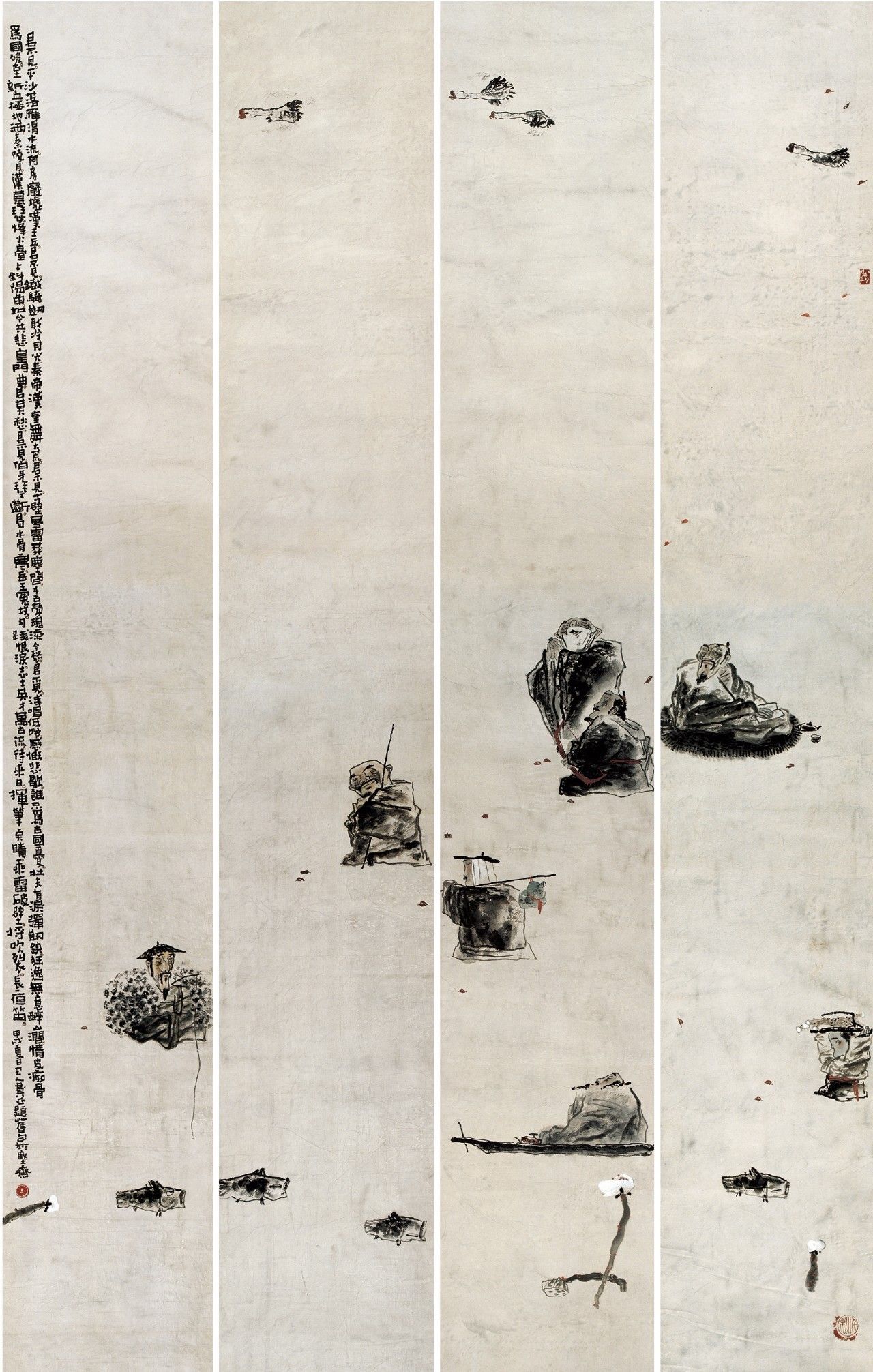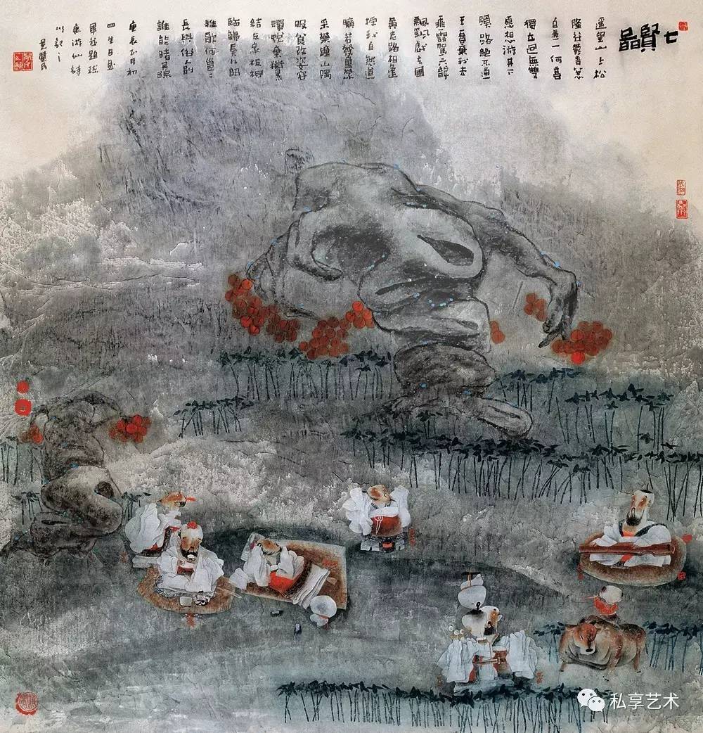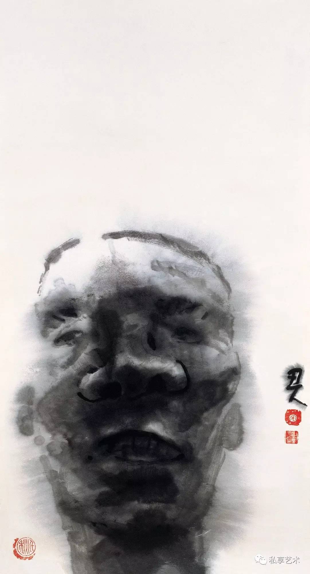 视觉上的简化,首先要对物象进行提炼。这种提炼以扎实的课堂与现场写生和光影素描为基础,但他并没有循此路数发展下去(发展下去的结果是成为第二个叶浅予、黄胄、周思聪......唯独不能成为他自己),而把汲取灵感的范围扩大到几个相隔甚远的领域——漫画的夸张与黑色幽默、汉画简化的块状感与黑白对比,甚至岩画和世界范围内的“原始艺术”的造型与符号。漫画和汉画是中国绘画的边缘,但并非与水墨画传统绝缘,而岩画和原始艺术则已被吸纳为西方现代艺术的元素,对它们的利用也是中国画形式现代化的一种路径。为了与画面造型与气质相符,他的书法也取法有民间渊源的魏碑字,主体来自龙门造像记,相容“二璺”,字形和用笔都方正古拙,劲力内含,与他的自署“丑人”相得益彰。