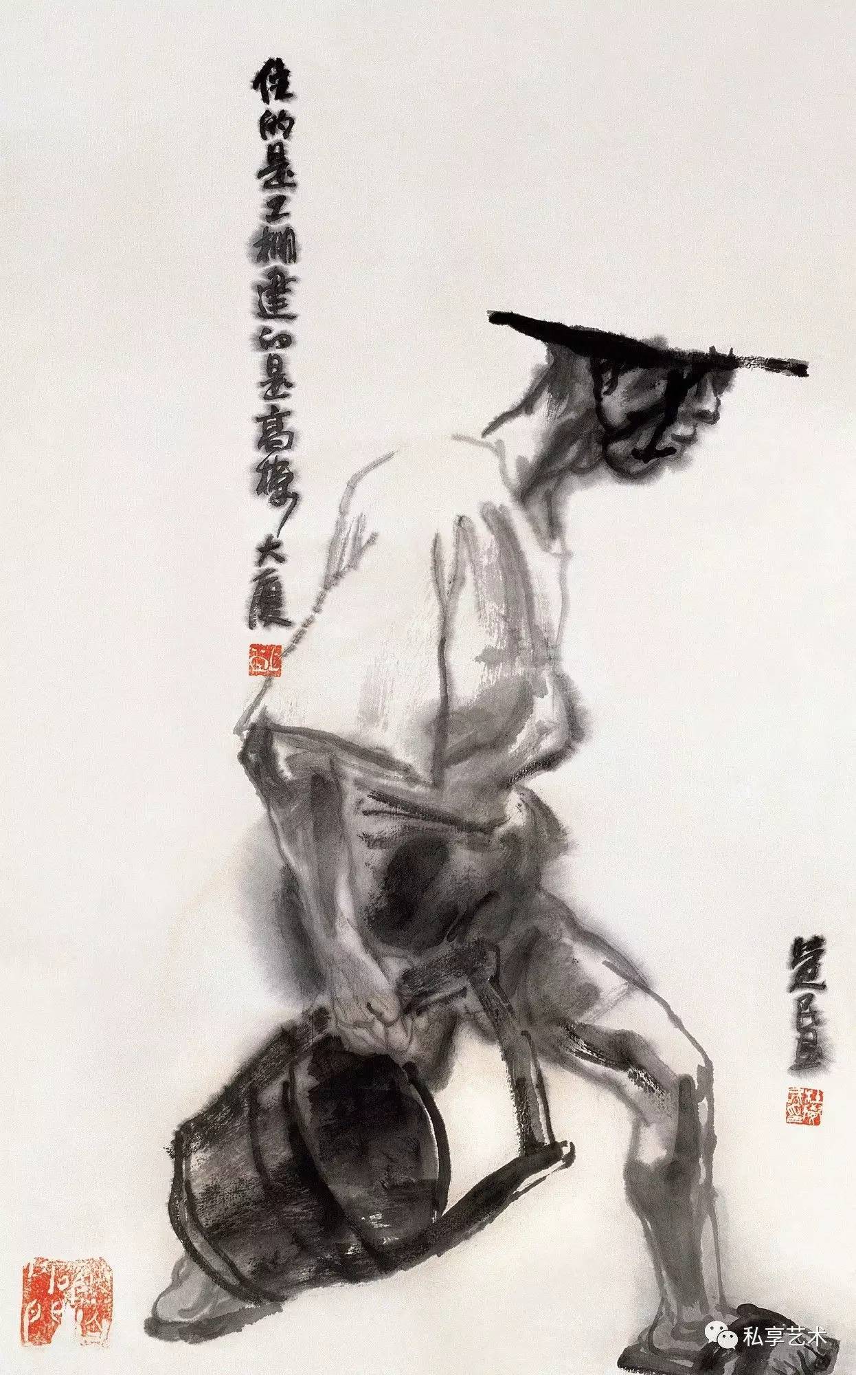 《住的是工棚,建的是高楼大厦》只画了一位放工后去打水的民工,穿著汗衫短裤,趿拉著拖鞋,手提空水桶,大步流星,低头疾行。他的草帽只有简单的一条横线画出帽檐,帽盖是化在刺眼的夕阳里了,白色汗衫上的线条断续与水渍变化也呼应著斜阳。而他的脸埋在深深的阴影里,脸颊上结实的肌肉似乎在全力对抗生活的重压。他两腿微曲跨开,裸露在外的深色的胳膊腿和黑色拖鞋,洗得发灰的黑色短裤、潮湿的黑褐色水桶,构成了画面下部的一个重色块,似乎就是承担重压的大地的力量。12个字的画题排成一列,像一条长长的棍子矗在他身后,这就是他社会身份的标记,画家的穷款则在他膝盖前方形成呼应。此画于至简中寓以丰富的平面设计感,文字亦作为画面的结构元素使用,而造型用笔有不著一字尽得风流之趣。