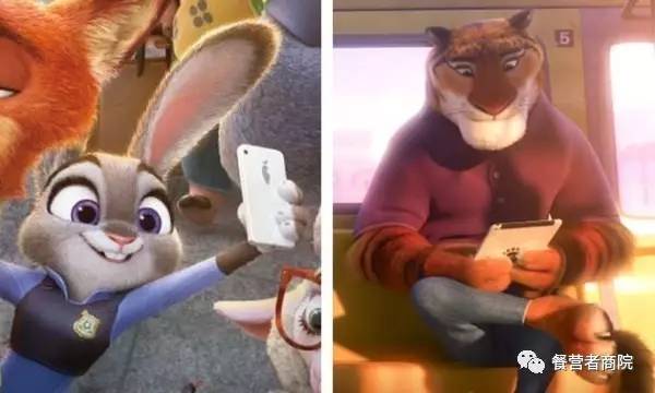 电影中兔子警官和路人老虎手中的电子产品logo这种小细节极cute而且毫无违和感,非但没有引起观众们的反感,反而因着幽默让人莞尔一笑。