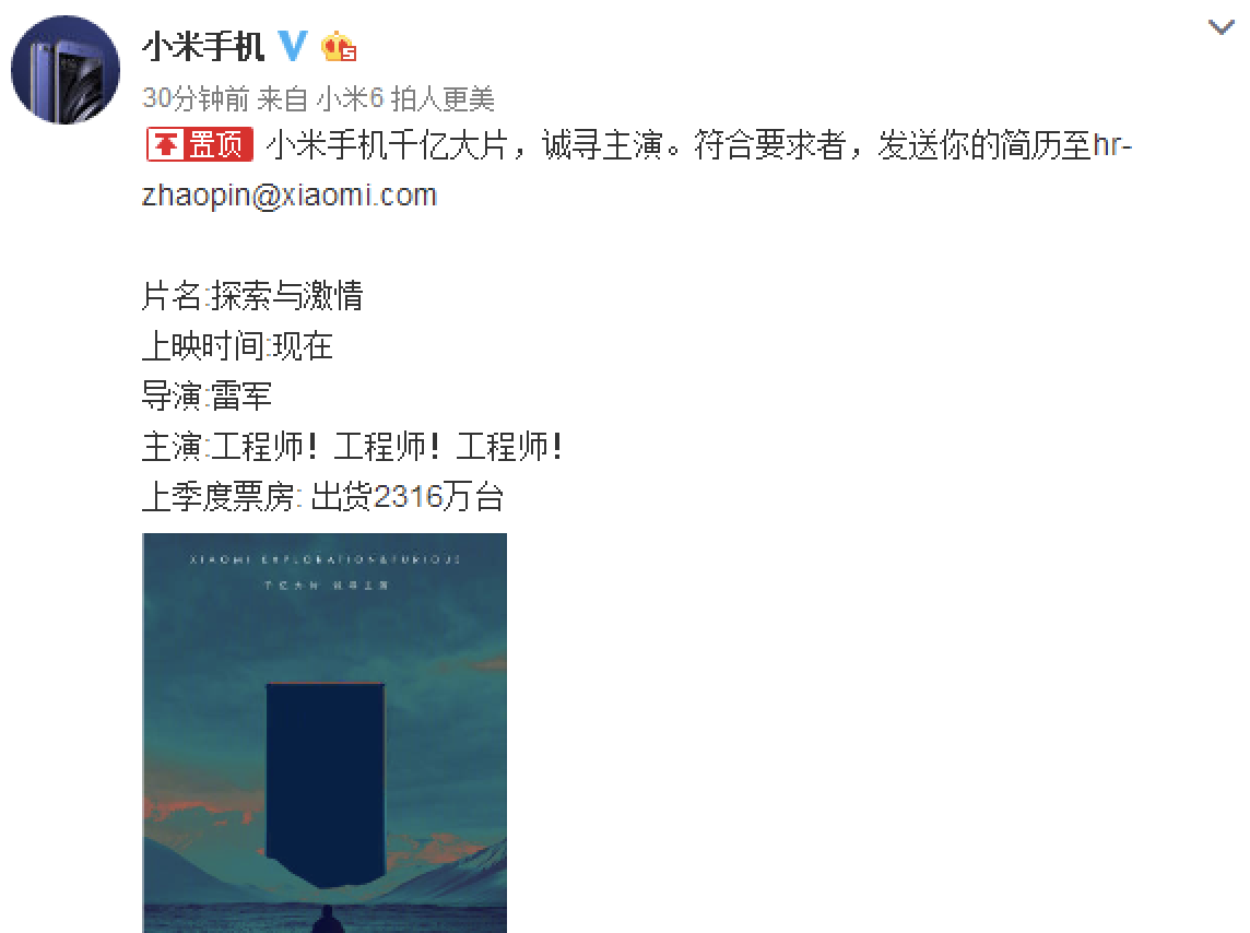 在这样的销量基础上,小米手机和雷军的官方微博今天又发布了一条公开的招聘信息,招聘超过一千名手机工程师,并且发布海报表示小米手机销量能够超过千亿,工程师会是主要角色。