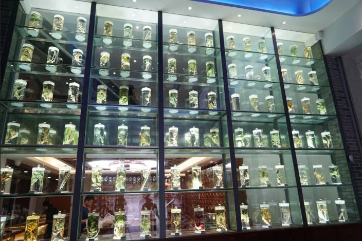 汉古中医深圳馆设有一大面的草药标本区,很有博物馆的视觉感,天花板以星空为主题,诠释了中医与天文学之间的联系。