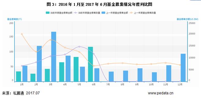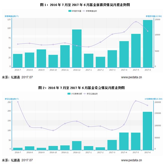 根据清科集团旗下私募通统计显示,2017年6月中外创业投资暨私募股权投资机构新募集92支基金,披露募资金额54支基金,环比下降20.7%;共募集金额144.28亿美元,环比上升41.4%。新设立227支基金,环比下降9.2%;披露目标规模82支基金,计划募资1553.98亿美元,环比上升120.8%,新设立的227支基金中83支基金进行了募资。