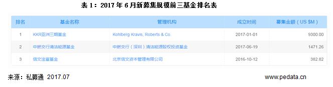 清科集团旗下私募通统计显示,在6月份新募集基金中,募资规模排名前三的基金分别为KKR亚洲三期基金、中燃交行(深圳)清洁能源股权投资基金和嘉兴信文淦富股权投资合伙企业(有限合伙)。其中KKR亚洲三期基金募资规模最大,认缴规模达93.00亿美元,排名第一,其中获得来自KKR集团及其员工的投资约8亿美元,是KKR有史以来自身投资金额排名第二的单支基金。