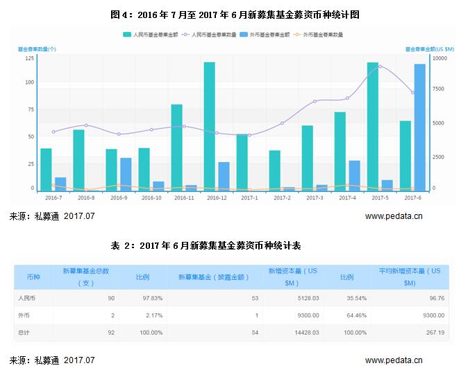 清科集团旗下私募通统计显示,2017年6月中外创业投资及私募股权投资机构新募集基金共计92支,其中54支基金披露募资金额,144.28亿美元,环比上升41.4%,同比上升163.1%。从基金币种看,6月新募集基金中,人民币基金共90支,占比为97.8%,披露募资金额的有53支,募资总额为51.28亿美元;其余为2支外币基金,募资总额为93.00亿美元。