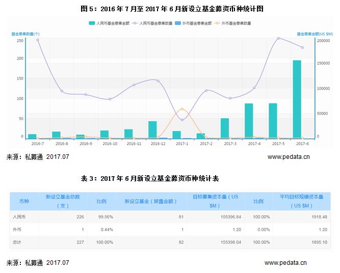 清科集团旗下私募通统计显示,2017年6月份中外创业投资及私募股权投资机构新设立基金共计227支,环比下降9.2%;披露目标规模的有82支,计划募集资金1553.98亿美元,环比上升120.8%,平均每支目标规模为18.95亿美元。