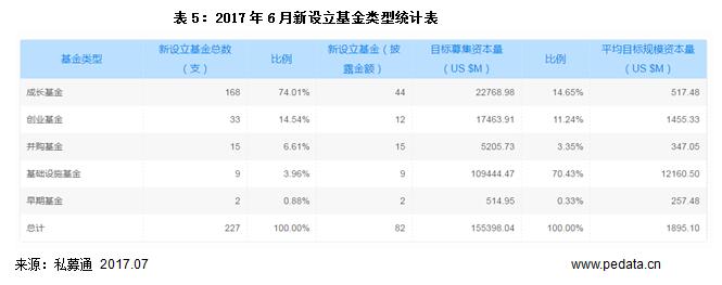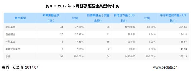 从基金类型来看,2017年6月新募集的有92支基金中,有54支基金披露募资金额,共募集资金144.28亿美元。其中当属成长基金最多,共有44支,占新募集基金数的47.8%,披露募资金额的有26支,募集资金127.80亿美元;创业基金25支,募资金额2.65亿美元;并购基金16支,募集资金12.99亿美元;基础设施基金7支,募资金额8388万美元。