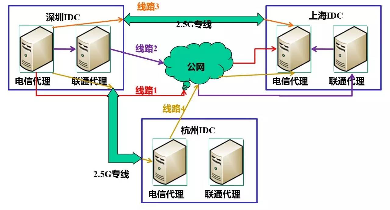 下图是笔者在前公司主导过的一个异地分布项目,当时在深圳和上海两地分布了完整的服务,杭州分布了有限服务(只在故障时临时启用)。从图中可以看到深圳和上海两地的同步和互访通道建立了4条,并根据实时监控的通道质量来动态调度。
