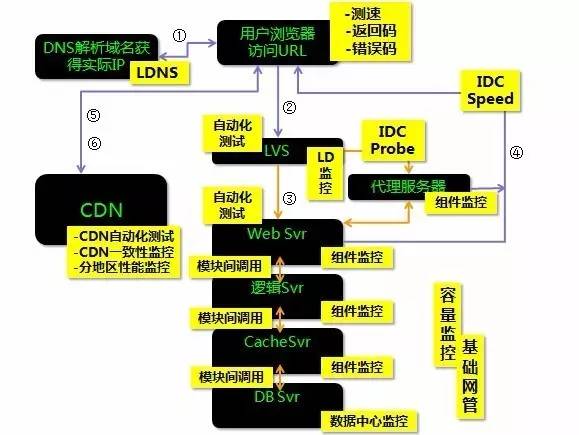 何谓“立体化”监控,这里借用一张典型的多层Web服务架构的监控需求图来说明: