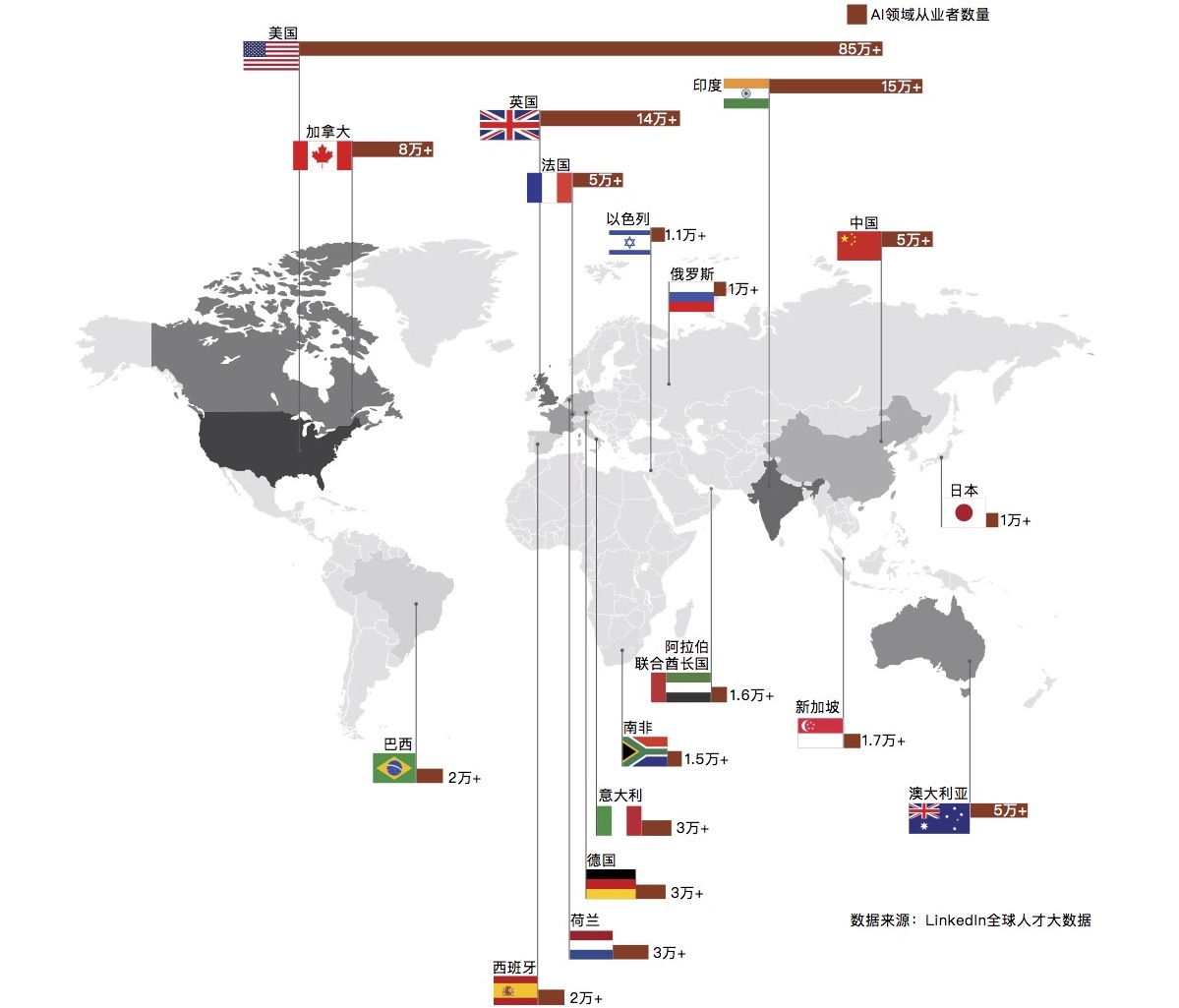 截至2017年一季度,全球人工智能领域专业技术人才数量超过190万,其中美国人工智能领域专业技术人才总数超过85万,高居榜首。中国人工智能领域专业技术人才总数超过5万人,排在全球第7位。印度、英国、加拿大和澳大利亚分列第2至第5位。