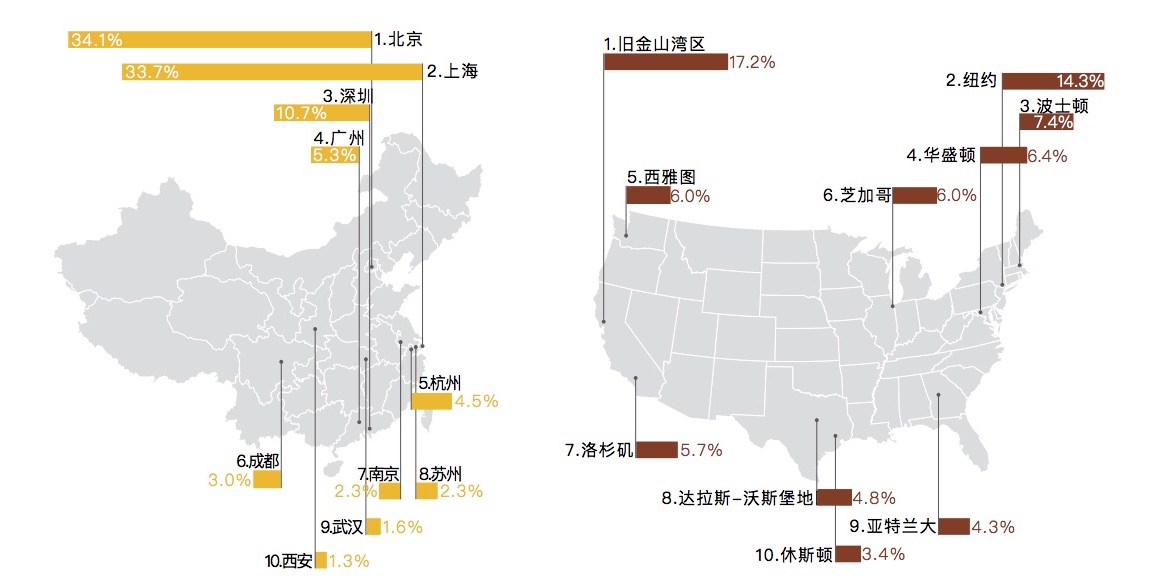 而美国AI人才主要分布相对分散,主要聚集在硅谷所在的旧金山湾区,以及美国东海岸的纽约、波士顿等地区。其中旧金山湾区和纽约地区,占比分别为17.2%和14.3%。波士顿、华盛顿和芝加哥紧随其后,分列第3-5位。