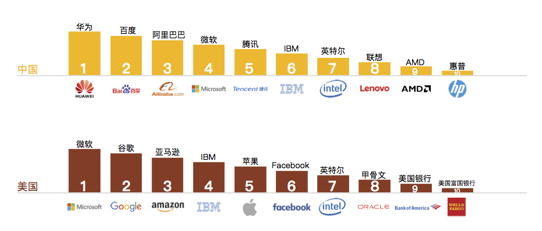 值得注意的是,在美国Top10榜单中,有两家金融机构上榜,分别是排在第9位的美国银行和第10位的国富银行,说明在美国,Fin-Tech已经成为趋势并形成规模。