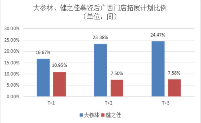 门店规模的扩张,是保证上市公司主营业务收入快速增长的有效途径。在其募资计划中,拓展门店是重中之重。未来三年,大参林持续加大对广西的门店扩张,比例由16.67%增加到24.47%,在广西的新增门店总数为288家。