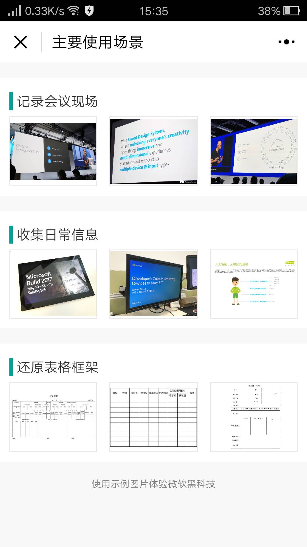 微软小蜜内置适用场景,在【示例图片】中主要含有记录会议现场、收集日常信息、还原表格框架等场景。