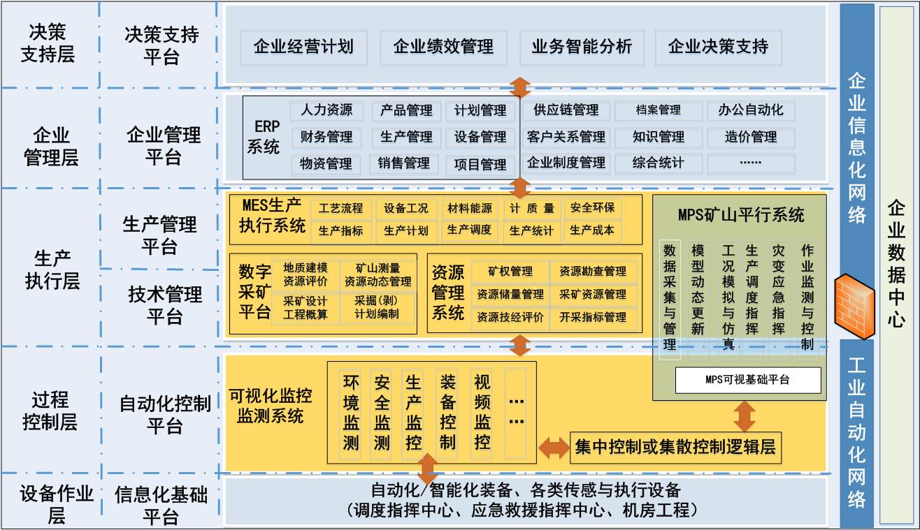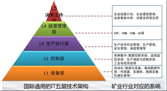 按照国际通用的IT技术架构,对应矿山行业,主要分为五个层次,分别为设备层、控制层、生产执行层、经营管理层和决策支持层,五个层次呈金字塔结构。