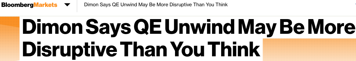 【戴蒙:央行缩减资产负债表带来的破坏力或大于人们估计】摩根大通董事长戴蒙(Jamie Dimon)周二表示,央行缩减购债计划是个前所未有的挑战,其破坏力有可能比人们想象的更大,“我们此前从未经历过这样的量化宽松,也从未有过这样的缩减行动。显然这本身就可能意味着风险,因为我们从未有过类似的经验。”