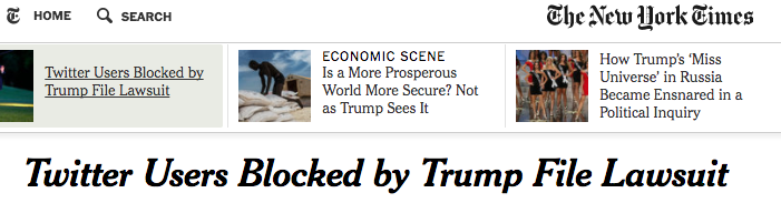 【推特用户将特朗普告上法庭称其违反了第一修正案】周二,一群被特朗普账号屏蔽的推特用户将美国总统和两名白宫高级助手告上了曼哈顿联邦法庭。这群推特用户由哥伦比亚大学骑士第一修正研究所(Knight First Amendment Institute)代表。
