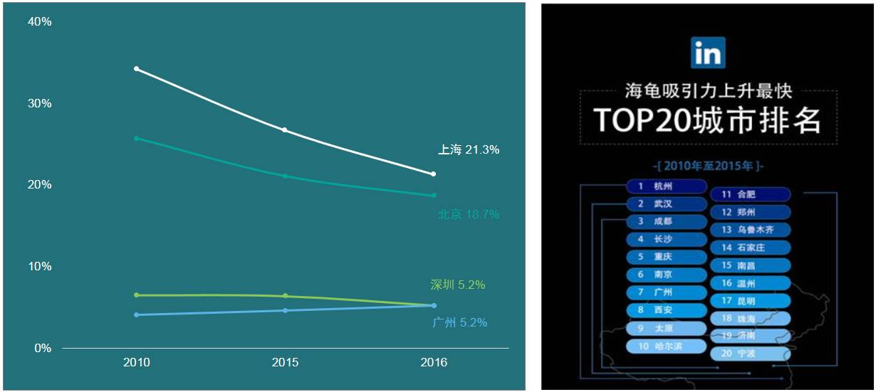 而在二线城市中,杭州对海龟的吸引力最高。根据领英发布的《2016中国新一线城市职场发达程度报告》,杭州对海归吸引力跃至榜首,正成为职场人士心中冉冉升起的就业“新福地”。G20峰会后杭州城市形象快速提升,同时互联网、电子商务等优势产业不断做大做强,创新创业氛围浓厚,阿里巴巴、网易等巨头对一线城市和海外人才的吸附力迅速增强,甚至能吸引到美国科技大企业任职高管“回流”。