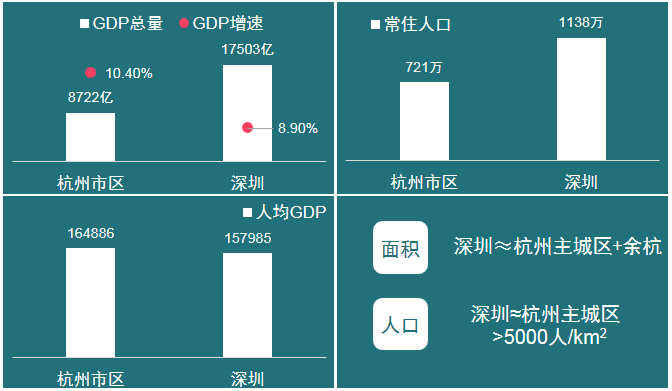 2016年深圳GDP全国第四,明年将超越2万亿目标,而杭州则刚刚超越1万亿目标,二者经济总量差距明显。考虑到深圳当前城镇化水平已是100%,而且多数时候谈及的城市多为其市区范围,因而为增强可比性,我们将杭州下辖的4个县市数据剥离,得到杭州市区与深圳的比较。首先面积上,杭州主城区加上余杭的面积约等于深圳面积,人口密度上,杭州主城区仅略低于深圳。经济体量上,杭州市区仅为深圳的一半,人口约63%,但人均GDP的差距小,表明杭州市区的发展水平与深圳接近。