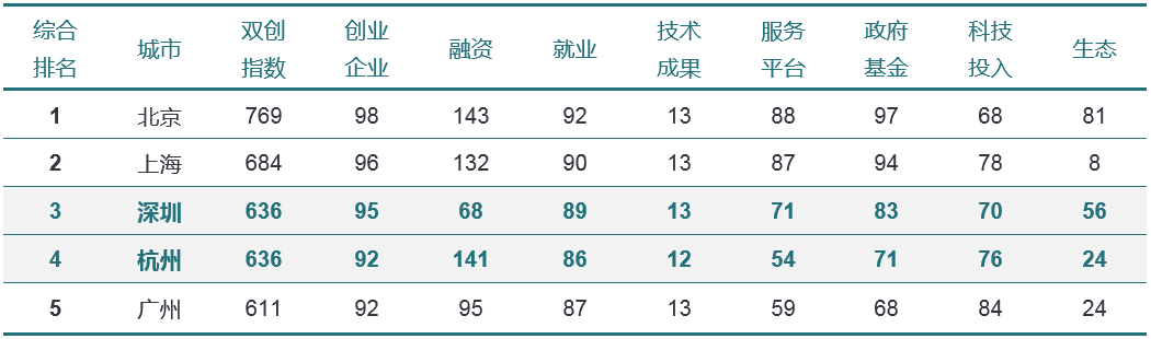 表:36kr公布的全国城市双创指数排名中,深圳、杭州得分相同