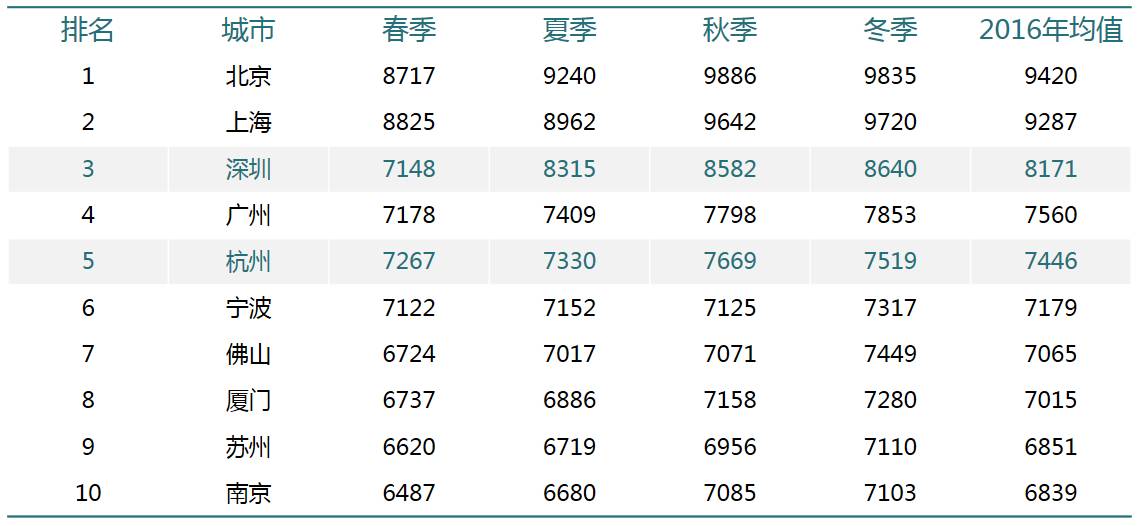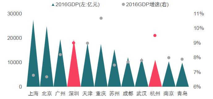 数据来源:中国城市统计年鉴,杭州、深圳2016年国民经济统计公报