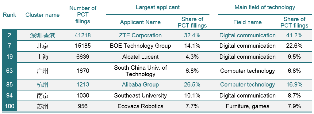 表:全球创新指数报告中Clusters of Inventive Activity TOP100 上榜的中国城市