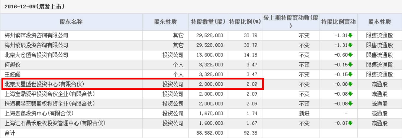 更有意思的是,紫晶存储的“豪华股东团”里还曾出现天星投资的身影。早在2015年紫晶存储尚未挂牌之时,天星资本就已经注资助力其进行新技术的研发。直至去年12月9日的前一轮定增时,天星资本尚在第六大股东之列,不过最新的十大股东名单上,天星已经消失。