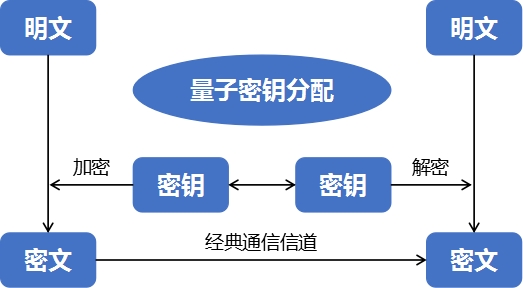 通过量子密钥分配可以对安全的通信密码加以建立,在一次一次的加密方式下,点对点方式的安全经典通信便得以实现。量子通信的安全性保障了密钥的安全性,从而保证加密后的信息是安全的。