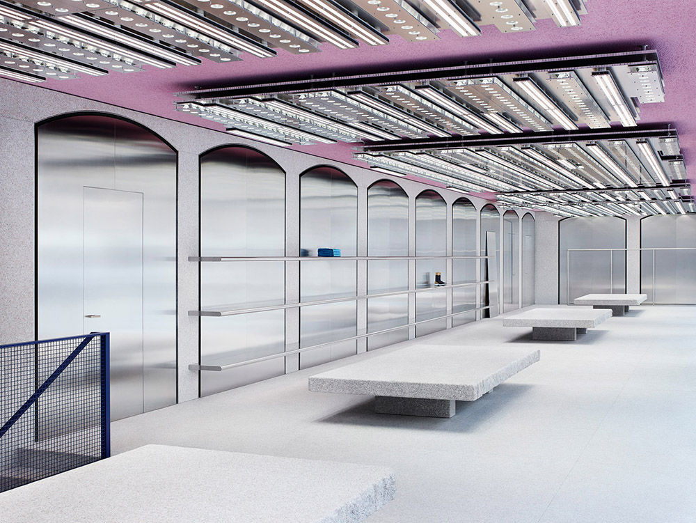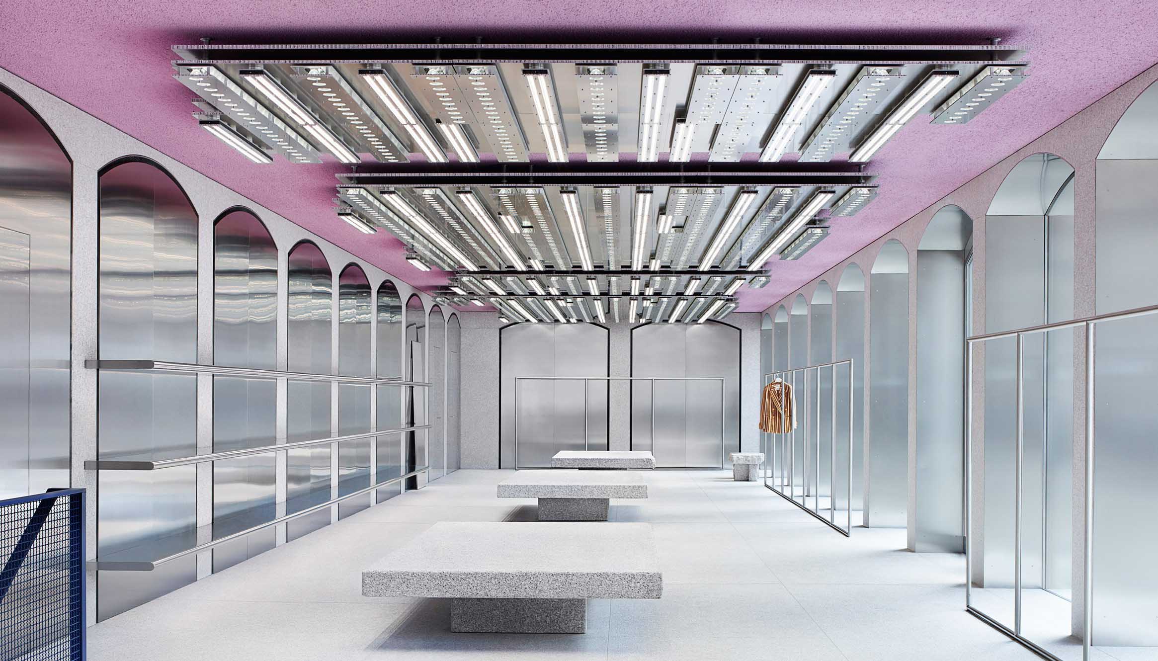 Acne Studios的旗舰店就选择开在一栋极具特色的建筑中,在意大利建筑中运用广泛的花岗岩墙体和拱门也被用于旗舰店内部的地板和家具设计,除此之外,品牌还专门为这家店定制了照明系统,名为“The Mega”——这些在粉色天花板上安装的多个抛光铝照明,能够感知白天透过窗户照进来的自然光,然后在晚上保持相同的亮度。