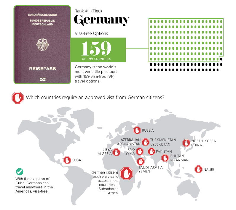 全球最好用的护照莫过于德国护照,全球有159个国家对其免签。持有德国护照的公民,可以畅游除瑙鲁(Nauru)和古巴以外的整个大洋洲和美洲大陆。其他对德国护照不免签的国家和地区包括:阿塞拜疆、阿富汗、 阿尔及利亚、巴基斯坦、不丹、朝鲜、俄罗斯、利比亚、缅甸、沙特阿拉伯、土库曼斯坦、乌兹别克斯坦、叙利亚、伊拉克、也门、中国,以及大部分撒哈拉以南的非洲国家。