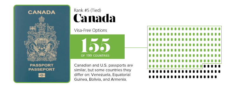 共有155个国家对加拿大免签,和美国相当。区别在于,持有加拿大护照的公民,去委内瑞拉、赤道几内亚、玻利维亚和亚美尼亚等国时,入境无需办理签证。