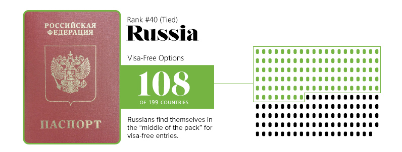 俄罗斯护照排名居中,共有108个国家对其免签。