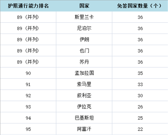 尼泊尔-36国免签,斯里兰卡-36国免签,索马里-33国免签,苏丹-36国免签,也门-36国免签,伊朗-36国免签,孟加拉国-35国免签,叙利亚-30国免签,伊拉克-26国免签,巴基斯坦-25国免签。而全球含金量最低的是阿富汗护照,由于饱受战争摧残,全球只有22个国家对阿富汗免签。世界范围内只有三个国家,阿富汗公民可以不受限制的出入境,他们是圣文森特岛,海地和密克罗尼西亚。