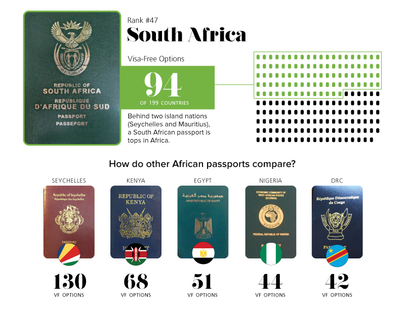 非洲各国中,最好用的护照来自于两个岛国:塞舌尔(130国免签)和毛里求斯(125国免签)。其次,排名靠前的还有南非护照,94国对其免签。