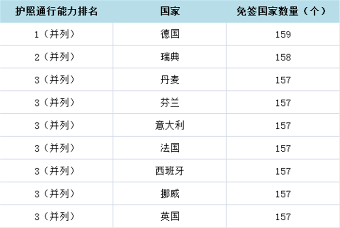 除了德国,大多数西欧国家的护照免签情况都排名靠前: