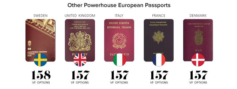除了德国,这些欧洲国家的护照在全球范围内也很通行:瑞典护照-158国免签,英国护照-157国免签,意大利护照-157国免签,法国护照-157国免签,丹麦护照-157国免签。