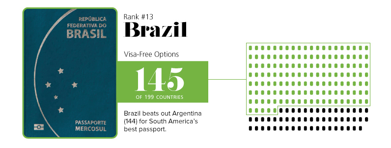 南美各国中,巴西护照最好用,共有145个国家对其免签;其次是阿根廷护照,144个国家对其免签。