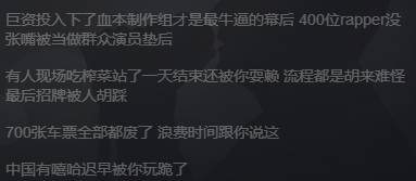 这波网综的热度炒的空前绝后,直接压过了前不久的网(lan)剧 “ 深夜食堂 ” ,不过和 “ 深夜食堂 ” 一样,“ 中国有嘻哈 ” 爆火靠的也是骂名。