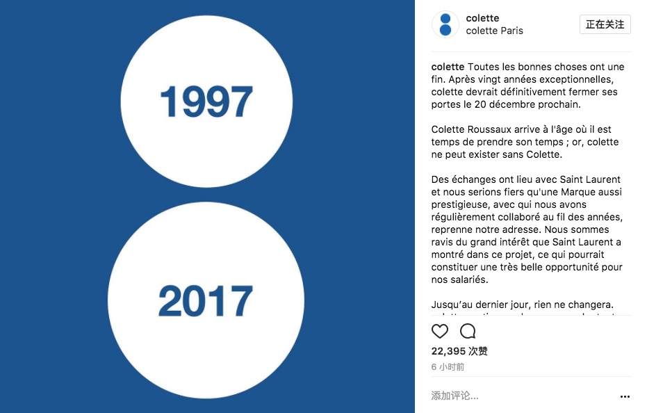 巴黎最具地标意义、同时也是全球时装人心目中最爱的概念买手店Colette昨日通过官方Instagram以及《女装日报》等媒体宣布,这家刚刚度过20周岁生日的店铺,将于今年年底关闭。
