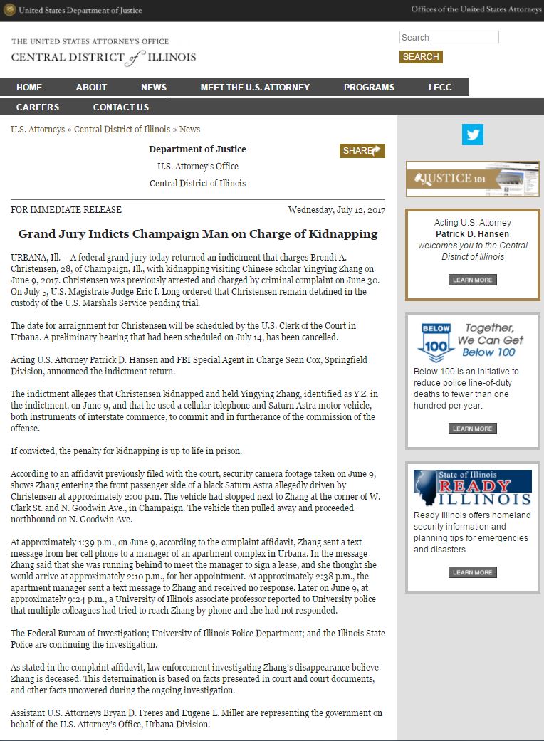 美国司法部网站7月12日发布消息说,美国联邦大陪审团当天正式起诉绑架中国访问学者章莹颖的嫌疑人布伦特·克里斯滕森,原定14日进行的预审取消。