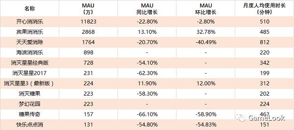 余下的消除游戏MAU呈减少状态,特别是消灭星星品牌繁多,多家公司运营,造成了一定的玩家认知混乱,在今年都有表现差强人意。
