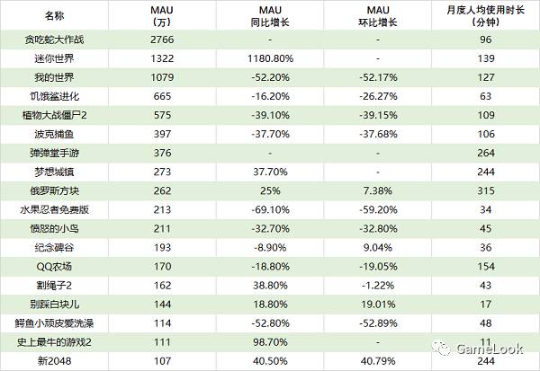 其中,《贪吃蛇大作战》以2766万的MAU冠绝群雄,打破了去年休闲游戏没有破千万产品的记录,而《迷你世界》、《我的世界》都突破了千万MAU,对于想要靠小而美的产品策略图为重度游戏的厂商而言是个利好消息。