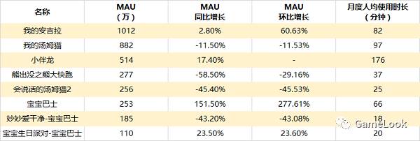 在表格中,只有《滚动的天空》和《疯狂动物园》两款新入榜产品,而唯一在老产品中MAU没有下滑的是《跑酷老奶奶》,仍然保持了10%的同比增长和环比增长。其余成功产品因生命周期等现实原因,均有不同程度的下降。