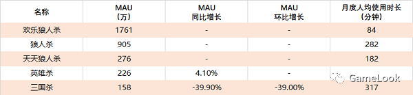 狼人杀是手游在2017年的一个风口,目前已经有3款狼人杀题材的产品MAU超过了100万。其中《欢乐狼人杀》后来居上,MAU达到1761万,其余两款《狼人杀》和《天天狼人杀》MAU分别为905万和276万。