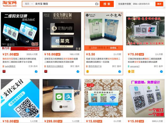在淘宝上,搜索关键词“支付宝微信”,出现的第一条就是“定制亚克力二维码支付宝微信扫码收银收款支付牌”,定价为16.8元的宝贝,月销3857笔。卖家提供了10余种样式供选择,买家只需要分别将支付宝、微信支付的收款二维码图片发送给卖家,就会被制作成亚克力立牌。