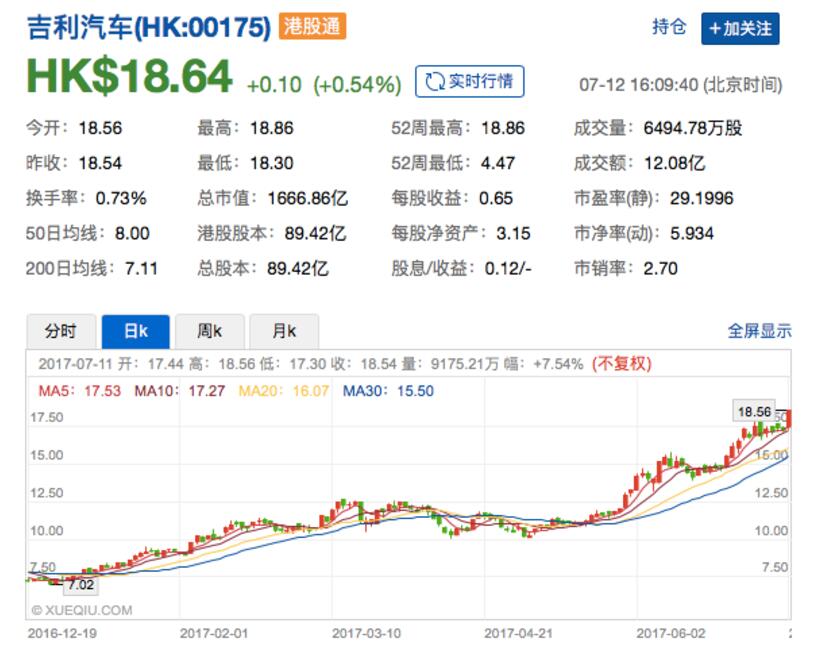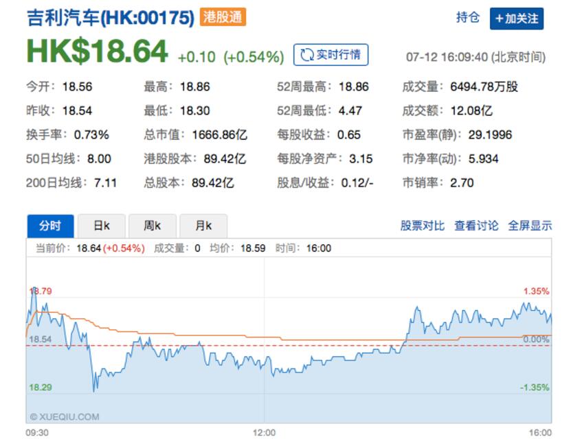 7月13日,吉利汽车再次高开,截至上午收盘报18.80港元/股,涨0.86%。